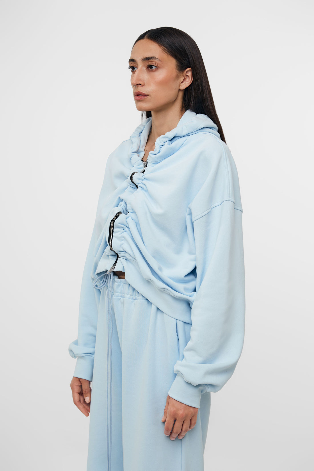 zip-up crop hoodie is shortened in blue and has long drawstrings that allow you to...