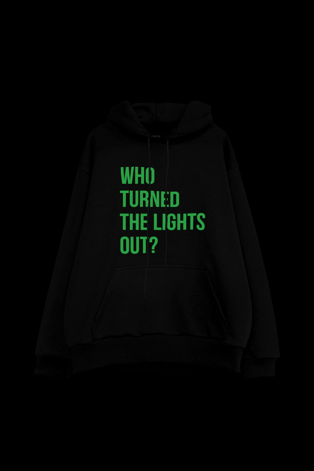 the hoodie with the inscription "who turned the light out?" is dedicated to the philosophical...
