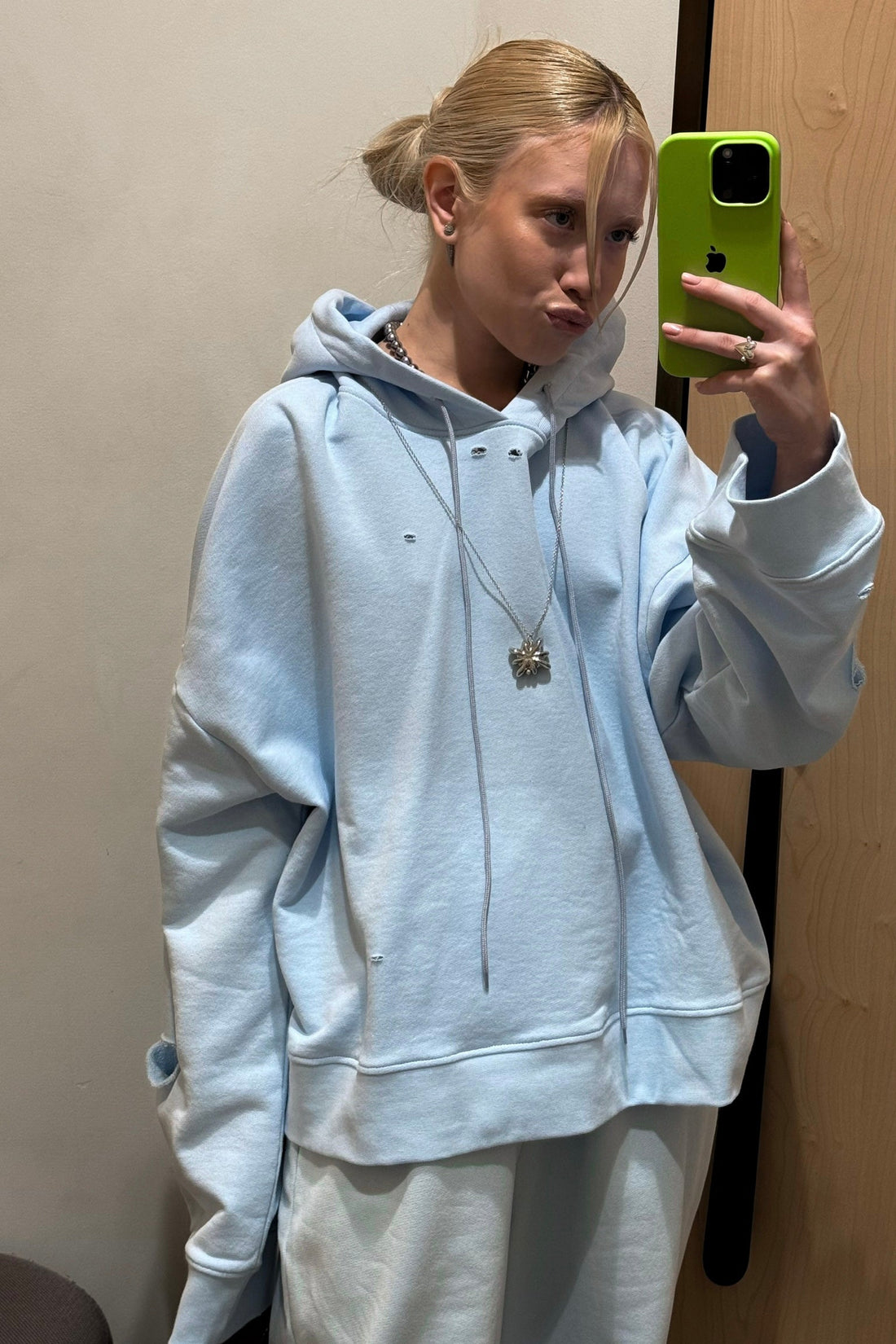 the hoodie "destroyed" in blue is made in an oversize style, has wide elongated sleeves and...