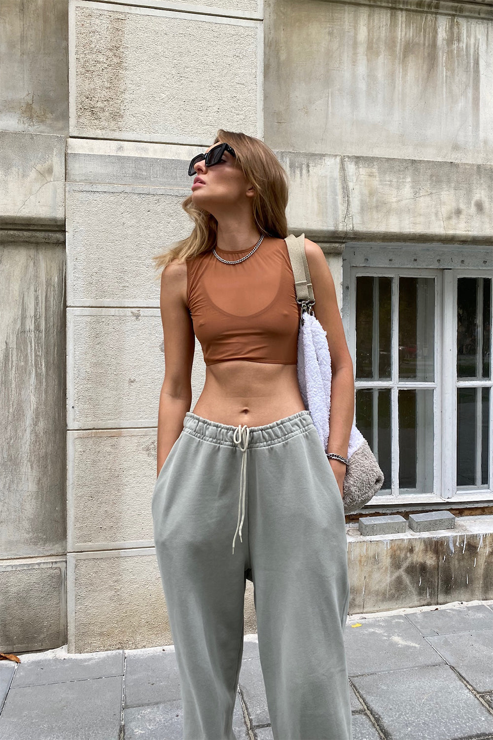 the double mesh top in brown has a semi-sheer silhouette, allowing you to play with...