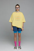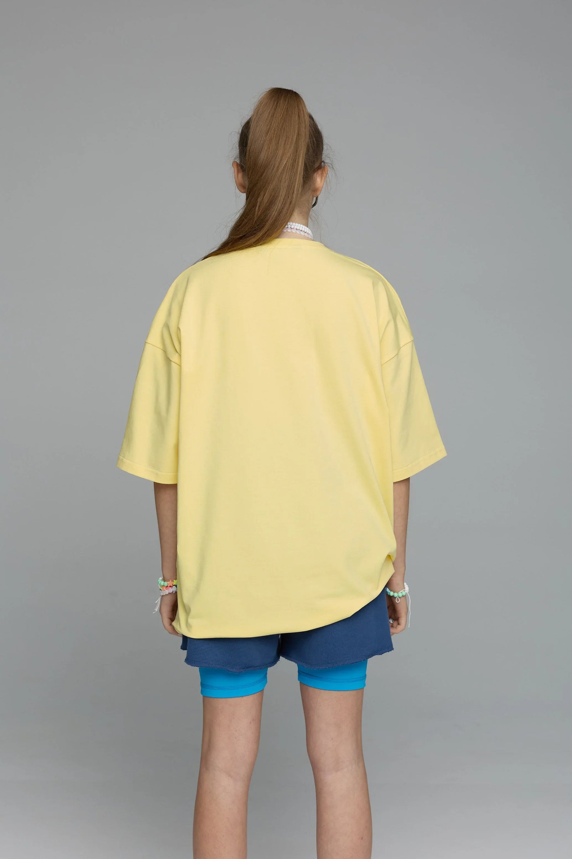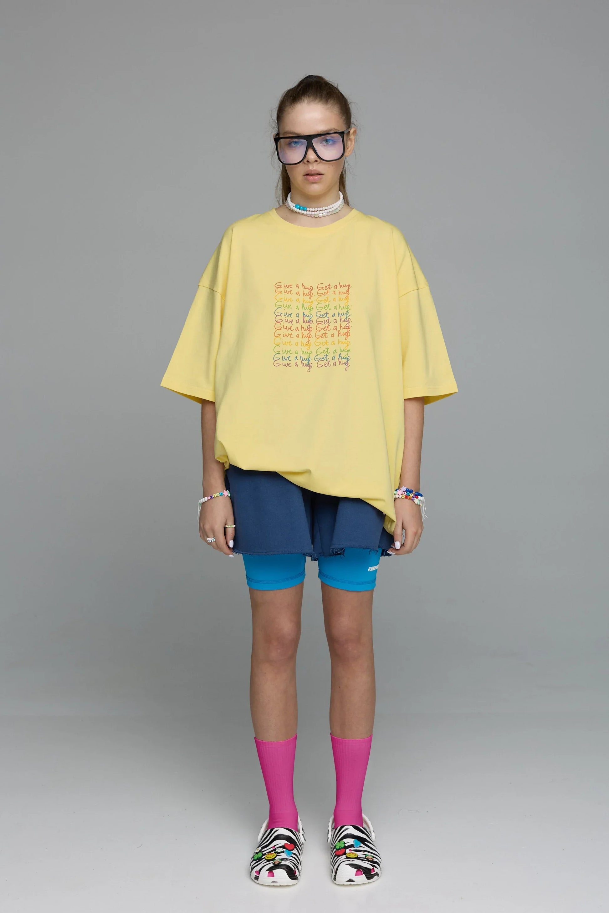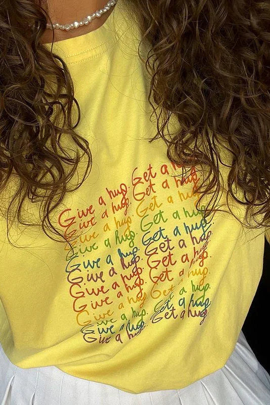 a baby yellow hug t-shirt with a front print. the relaxed fit makes it perfect for active days, workouts, or just taking it easy. this everyday staple pairs effortlessly with jeans, shorts, leggings, skirts or tracksuits.