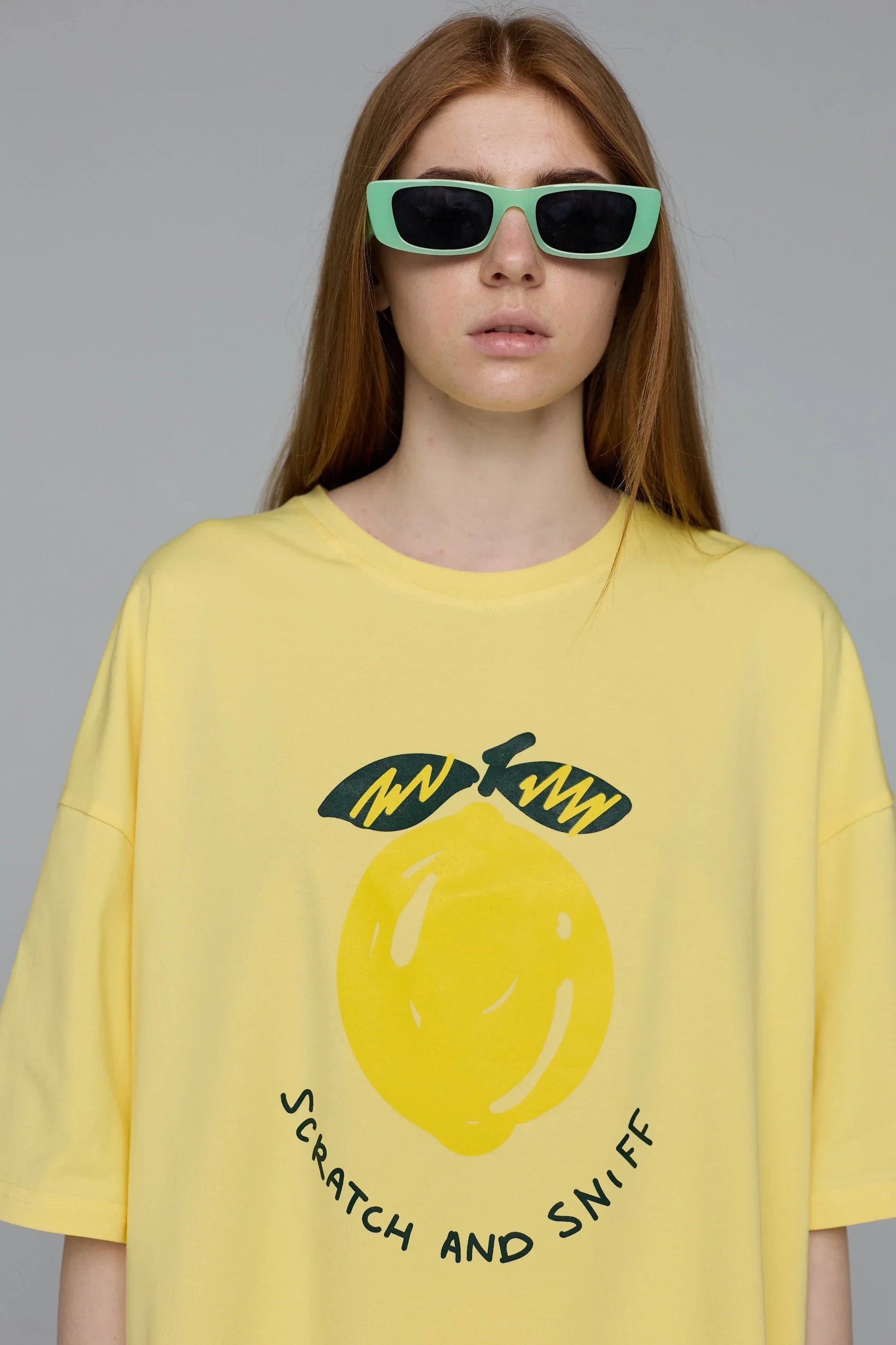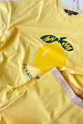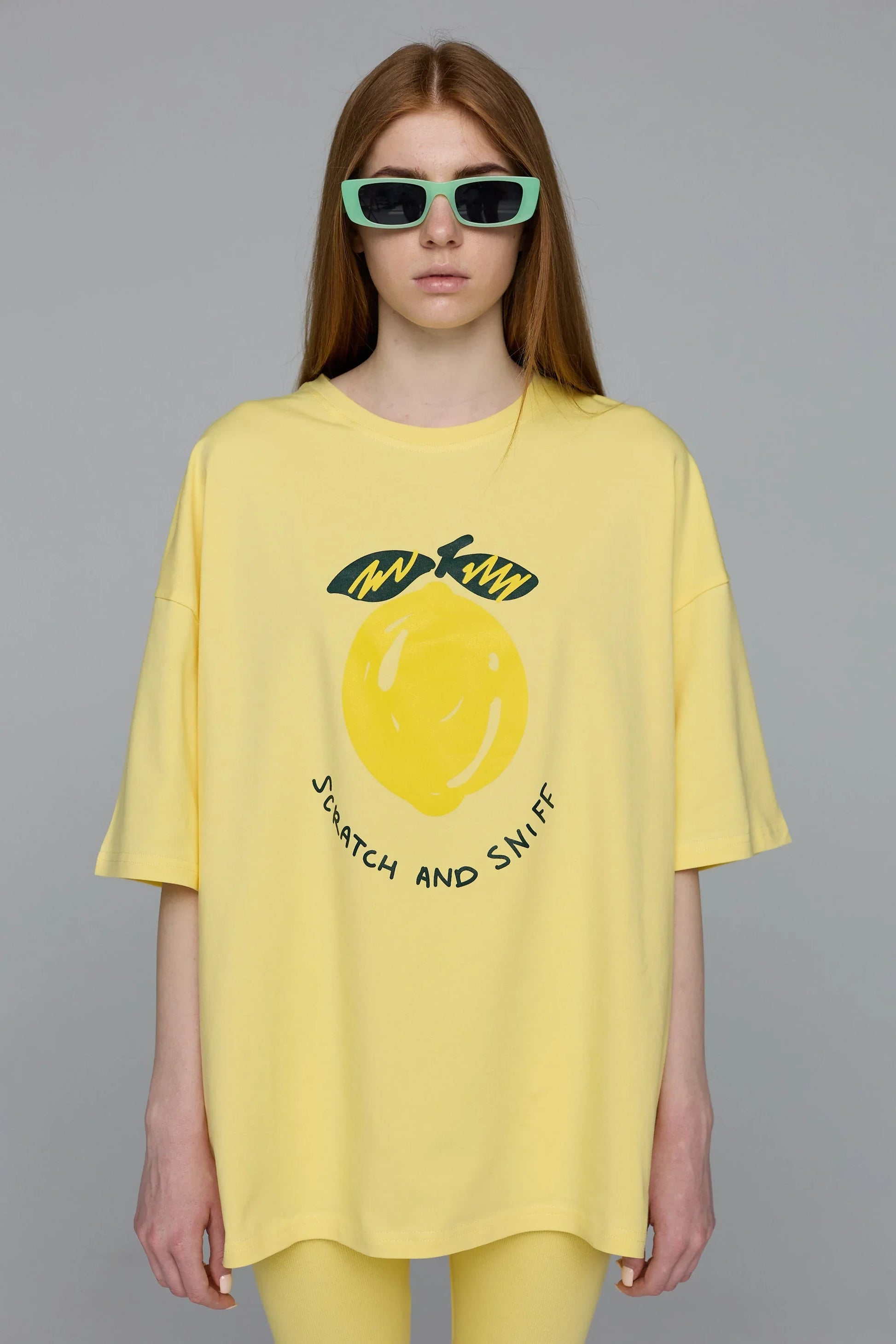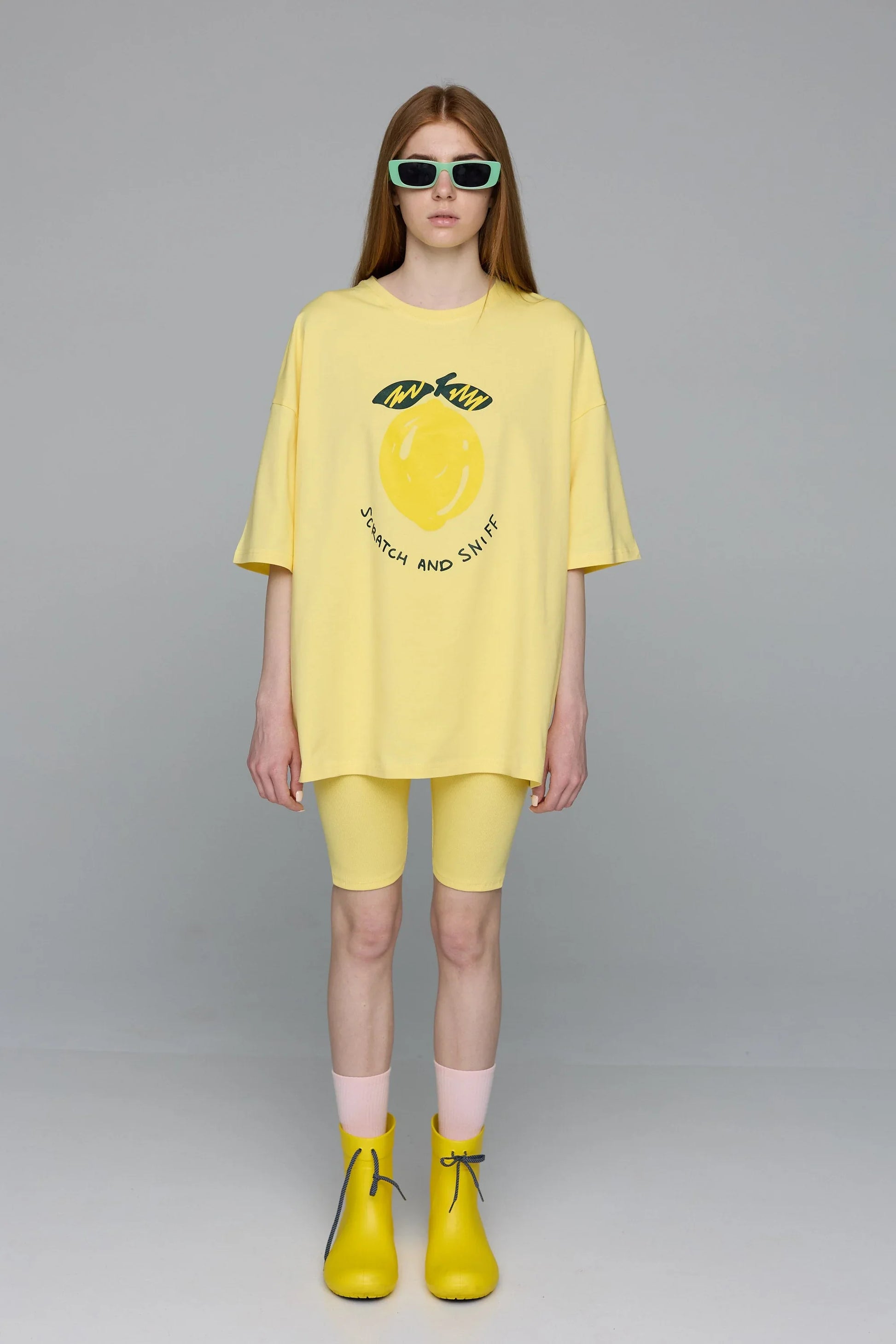 a baby yellow hug t-shirt with a front print. the relaxed fit makes it perfect for active days, workouts, or just taking it easy. this everyday staple pairs effortlessly with jeans, shorts, leggings, skirts or tracksuits.