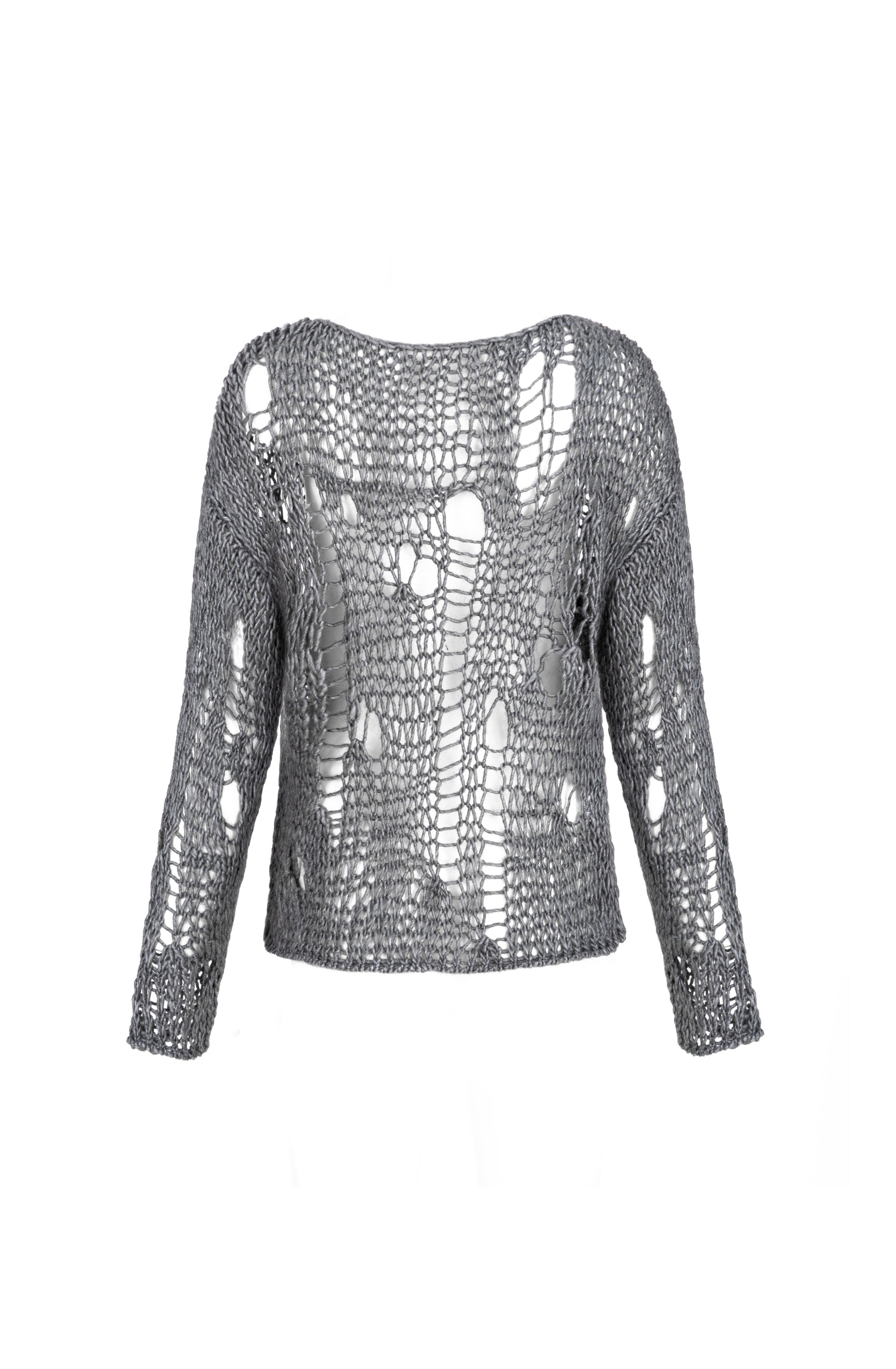 sweater in grey color has a loose knit that imitates holes. thanks to its loose fit and soft yarn, it is stretchable enough to fit any body type. if you want to have an oversized look, you can choose a larger size. it will be suitable for the demi-season with a top or t-shirt underneath or with a shirt or golf for the cold season
