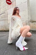 sweater in milk color has a loose knit that imitates holes. thanks to its loose fit and soft yarn, it is stretchable enough to fit any body type. if you want to have an oversized look, you can choose a larger size. it will be suitable for the demi-season with a top or t-shirt underneath or with a shirt or golf for the cold season