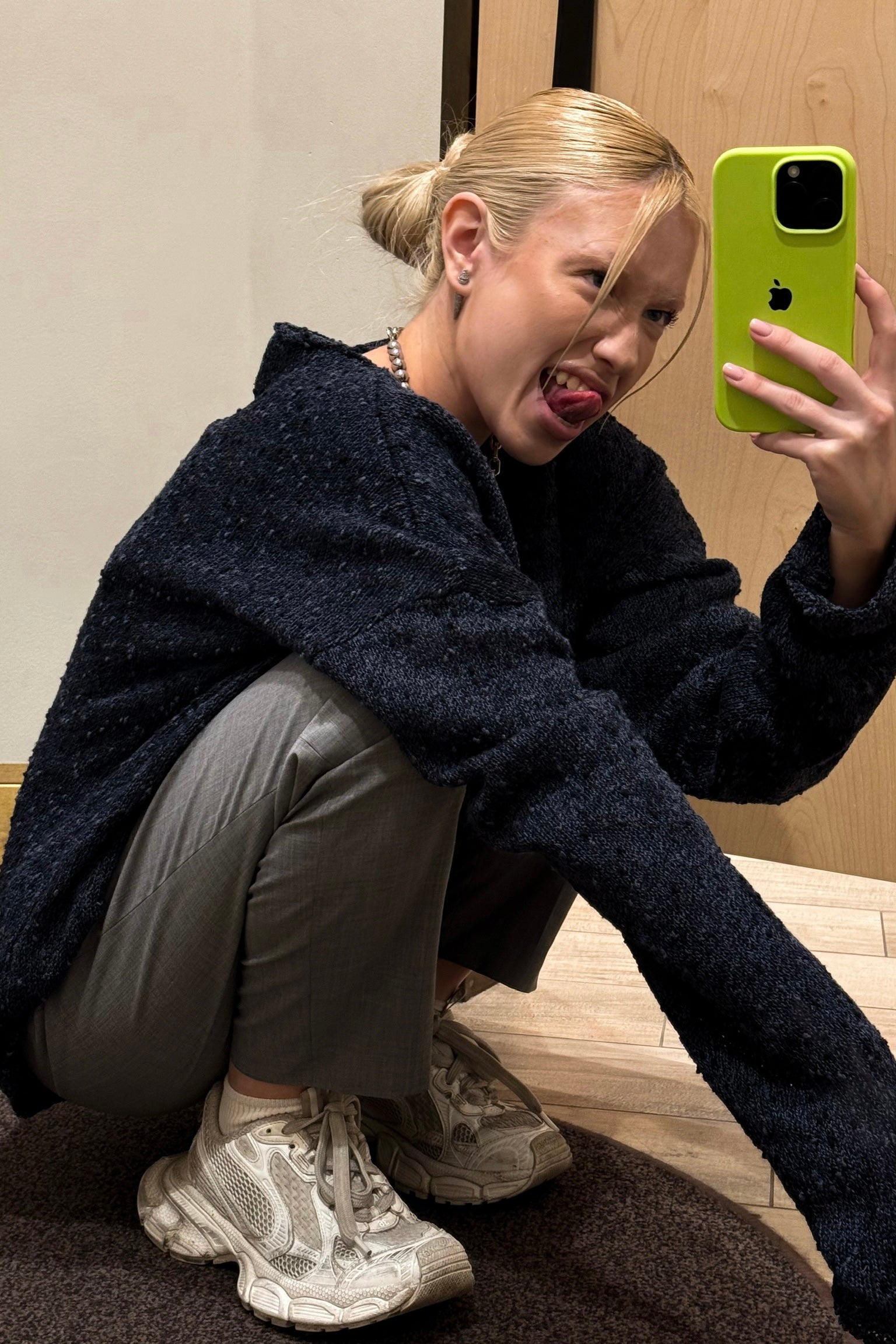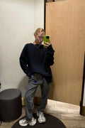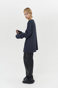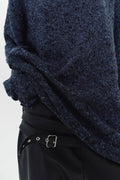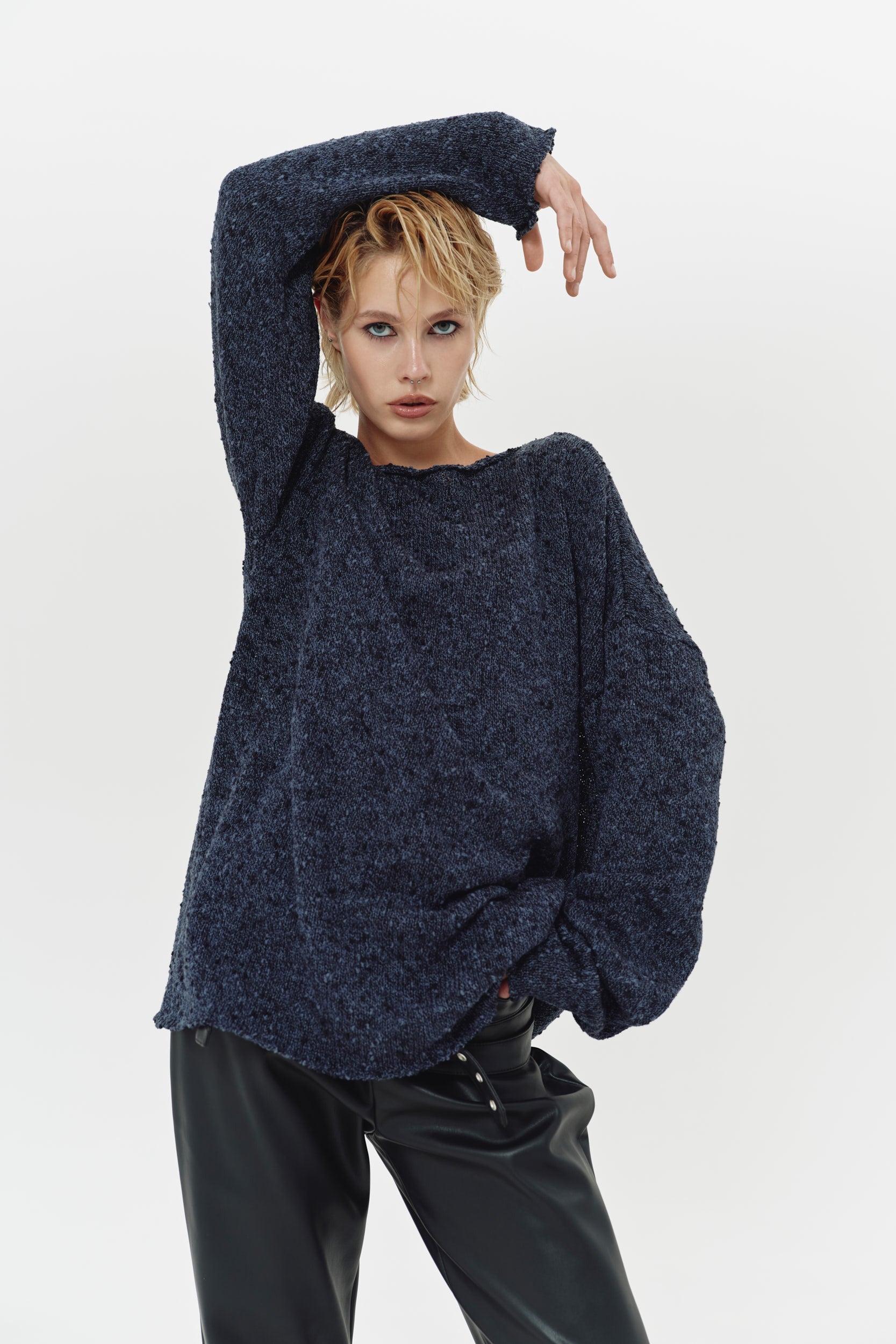 this knitted sweater, crafted from dark blue bouclé yarn with black flecks, offers both style and comfort. the oversized fit ensures freedom of movement, while the long sleeves complete the design, creating a relaxed silhouette.