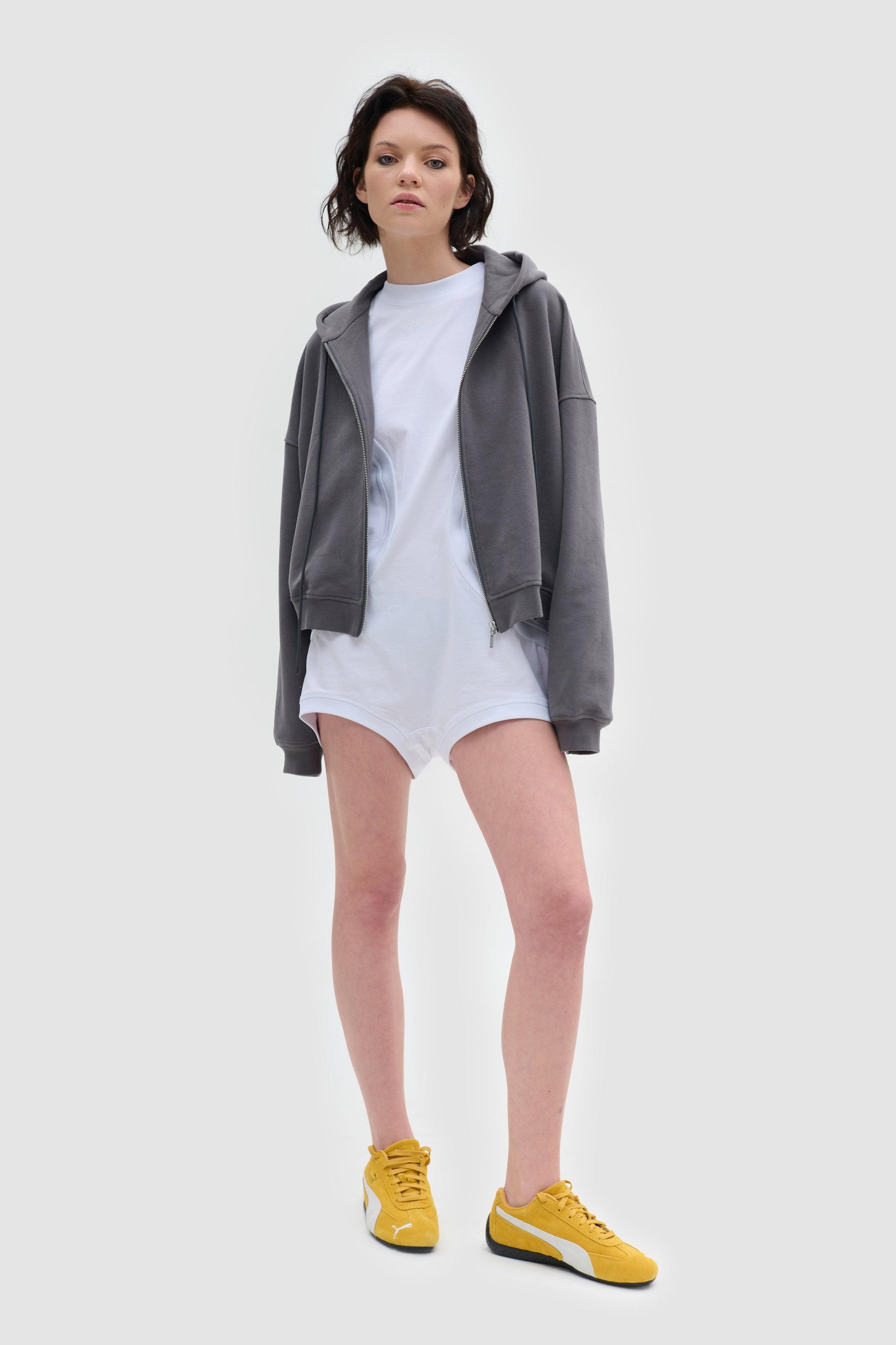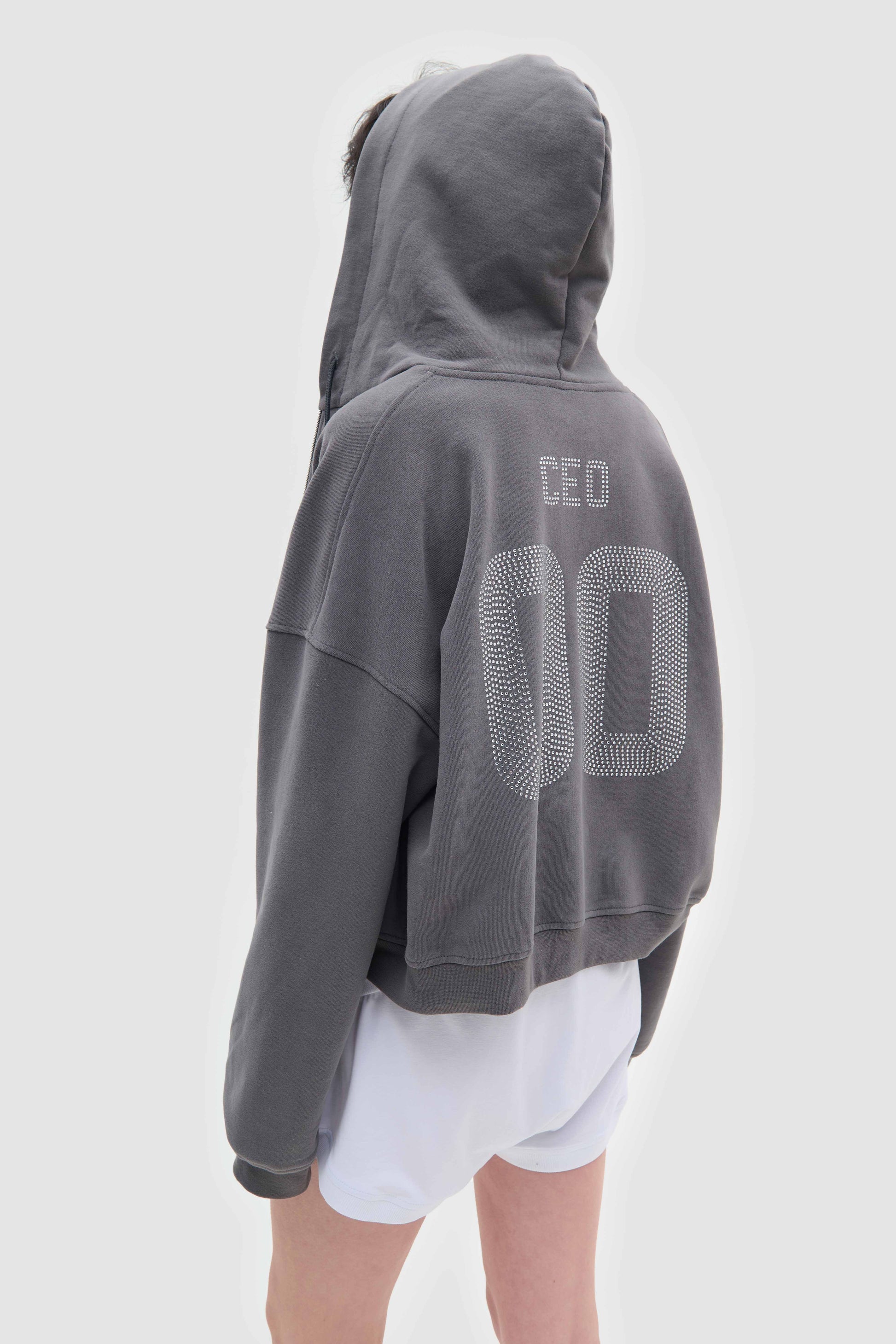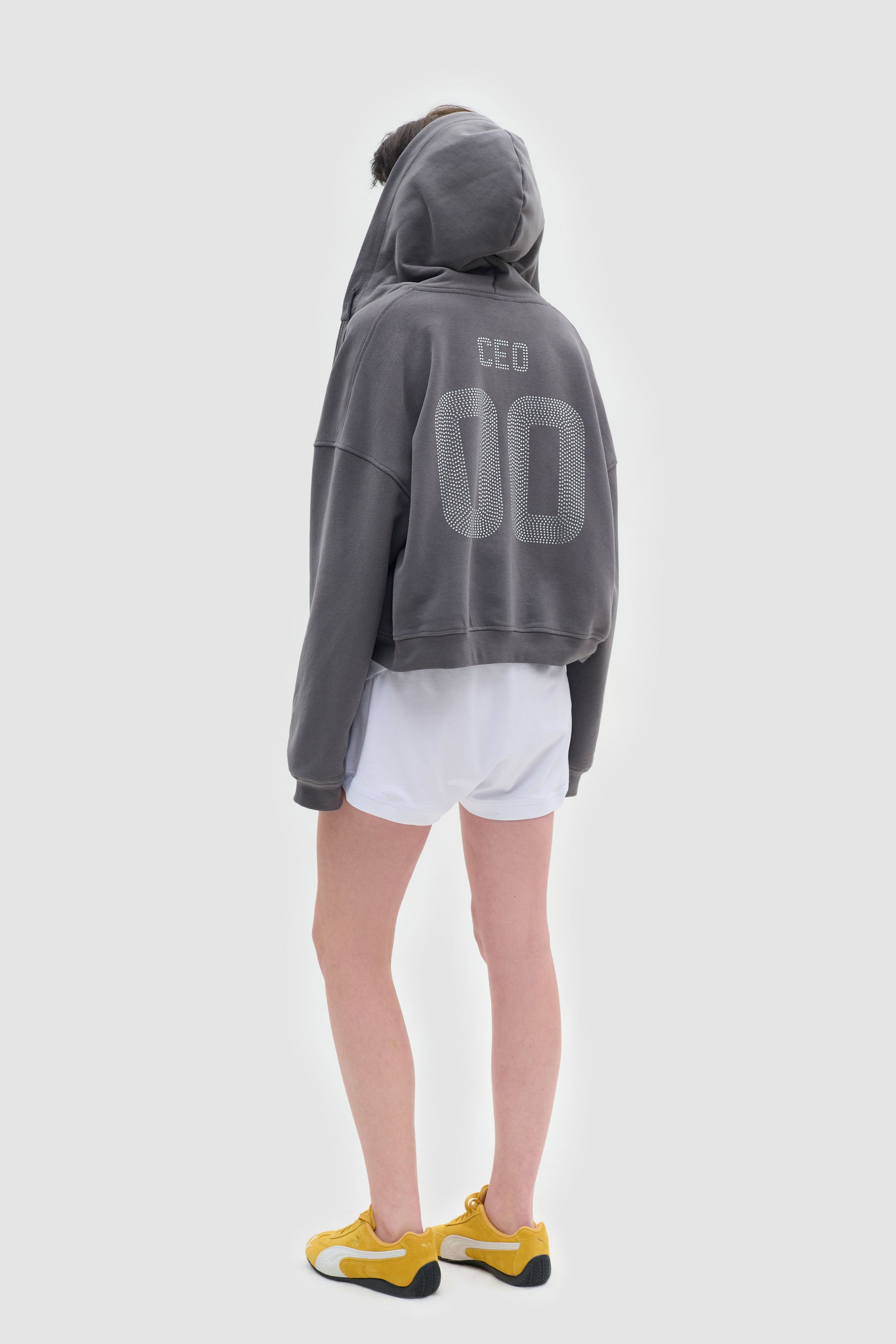 a cropped "ceo 00" zip-up – for those who know who's in charge. a graphite hue adds strictness, while the sparkle of rhinestones brings the right amount of audacity. voluminous silhouette, dense cotton, and a convenient zipper