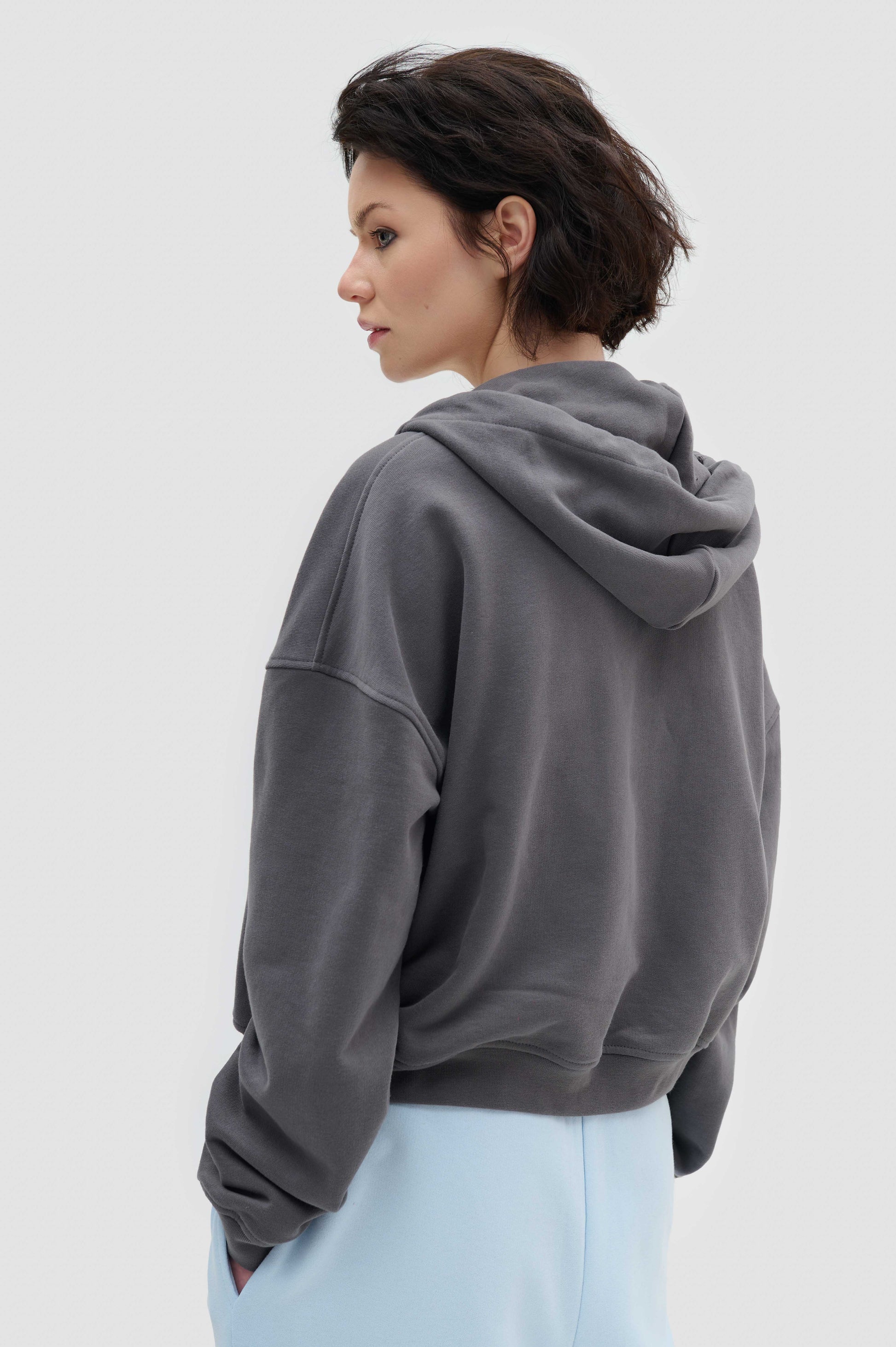 cropped zip-up hoodie with long laces – a basic piece with character. loose fit, dense cotton, comfortable fit. the long drawstrings add an accent, you can leave them loose or tie them to change the mood of the look