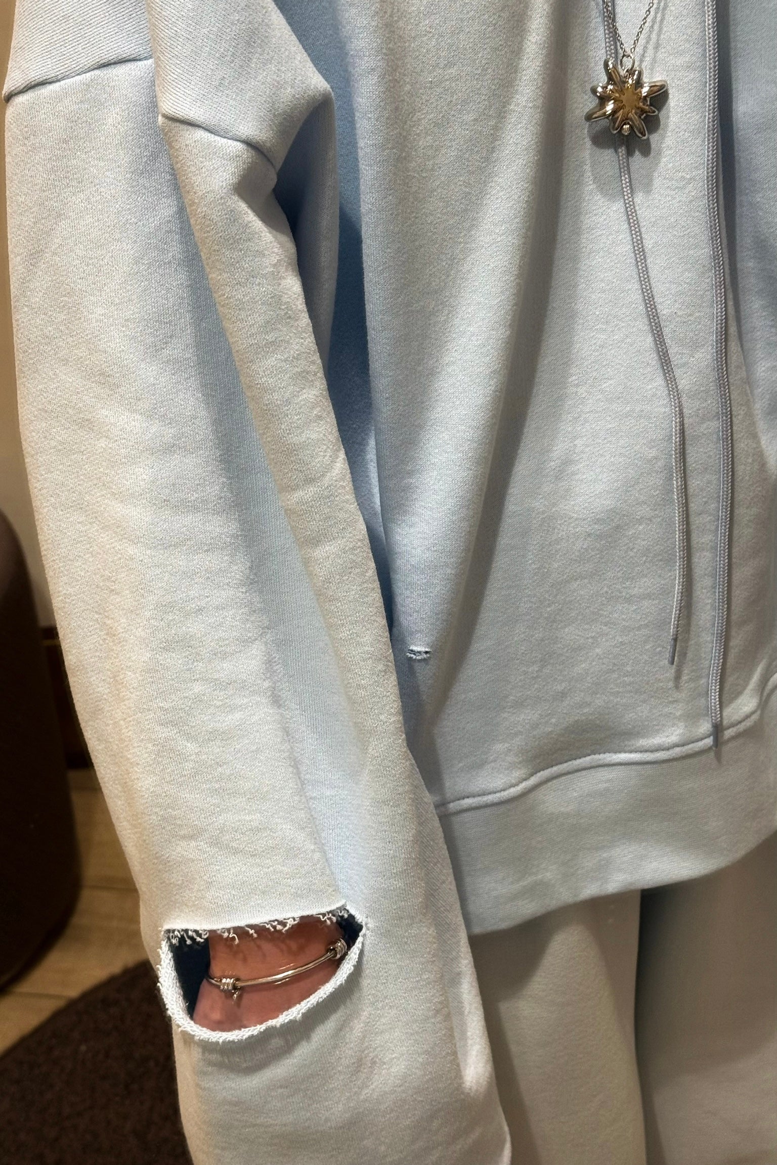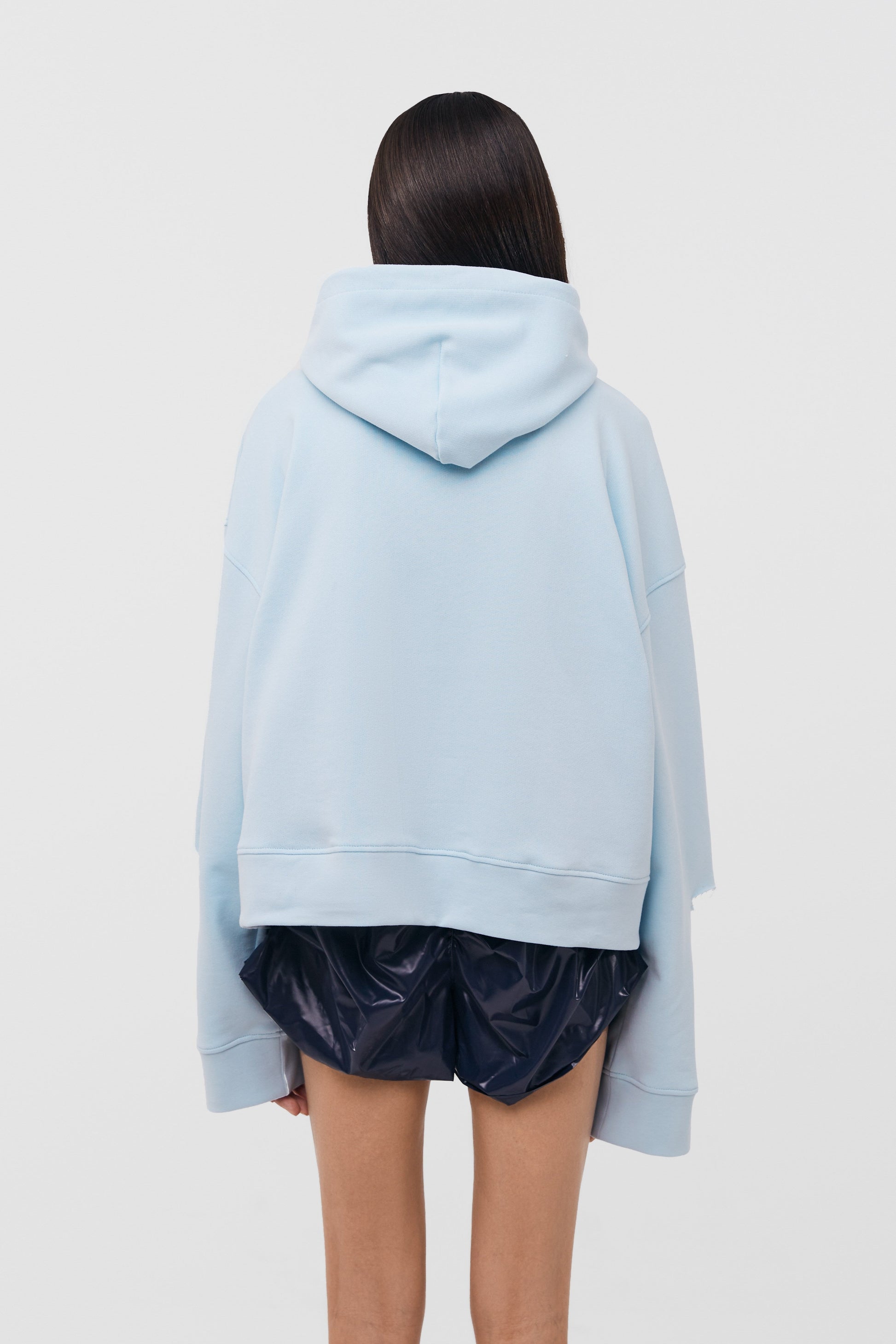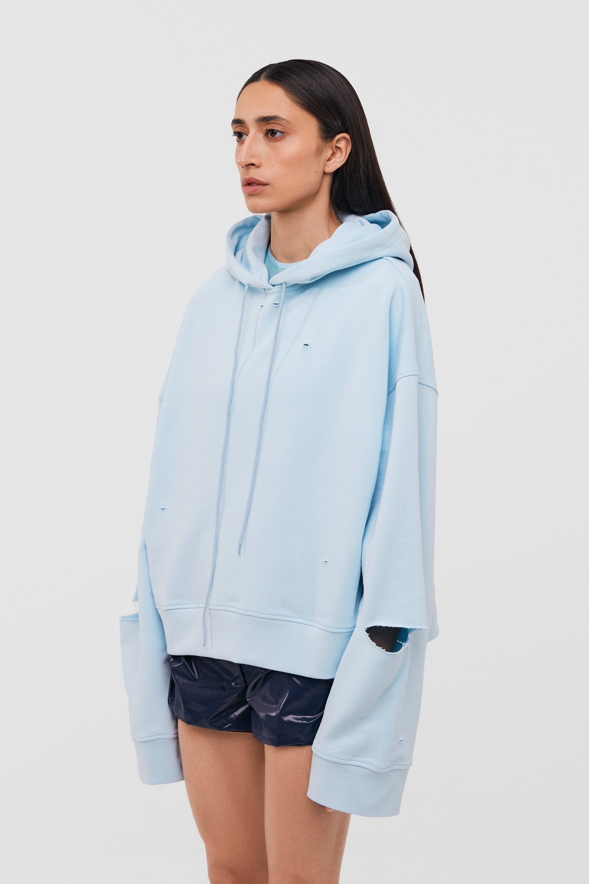 the hoodie "destroyed" in blue is made in an oversize style, has wide elongated sleeves and a decorative element in the form of laces. there are slits on the front and on the sleeves - one of the main elements of the "70s" collection in the spirit of punk culture