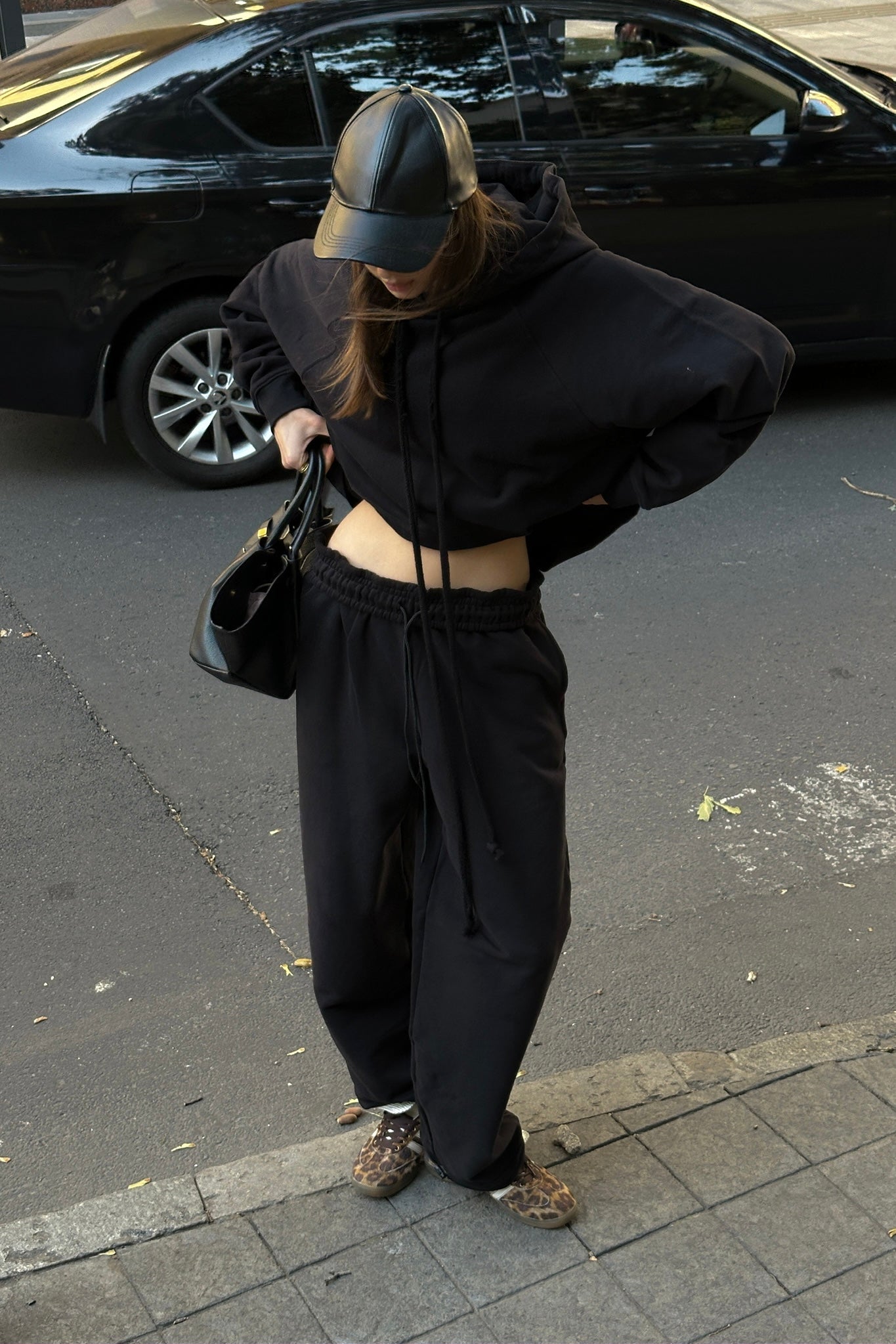 the "Groove" black pants feature an oversized fit with two side pockets and adjustable drawstrings at the waistband and cuffs, allowing you to customize the length and shape for different looks. the waistband is designed with an inside-out detail, adding a unique touch. these pants are perfect for creating a comfortable and stylish look, whether for everyday wear or active leisure.