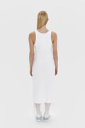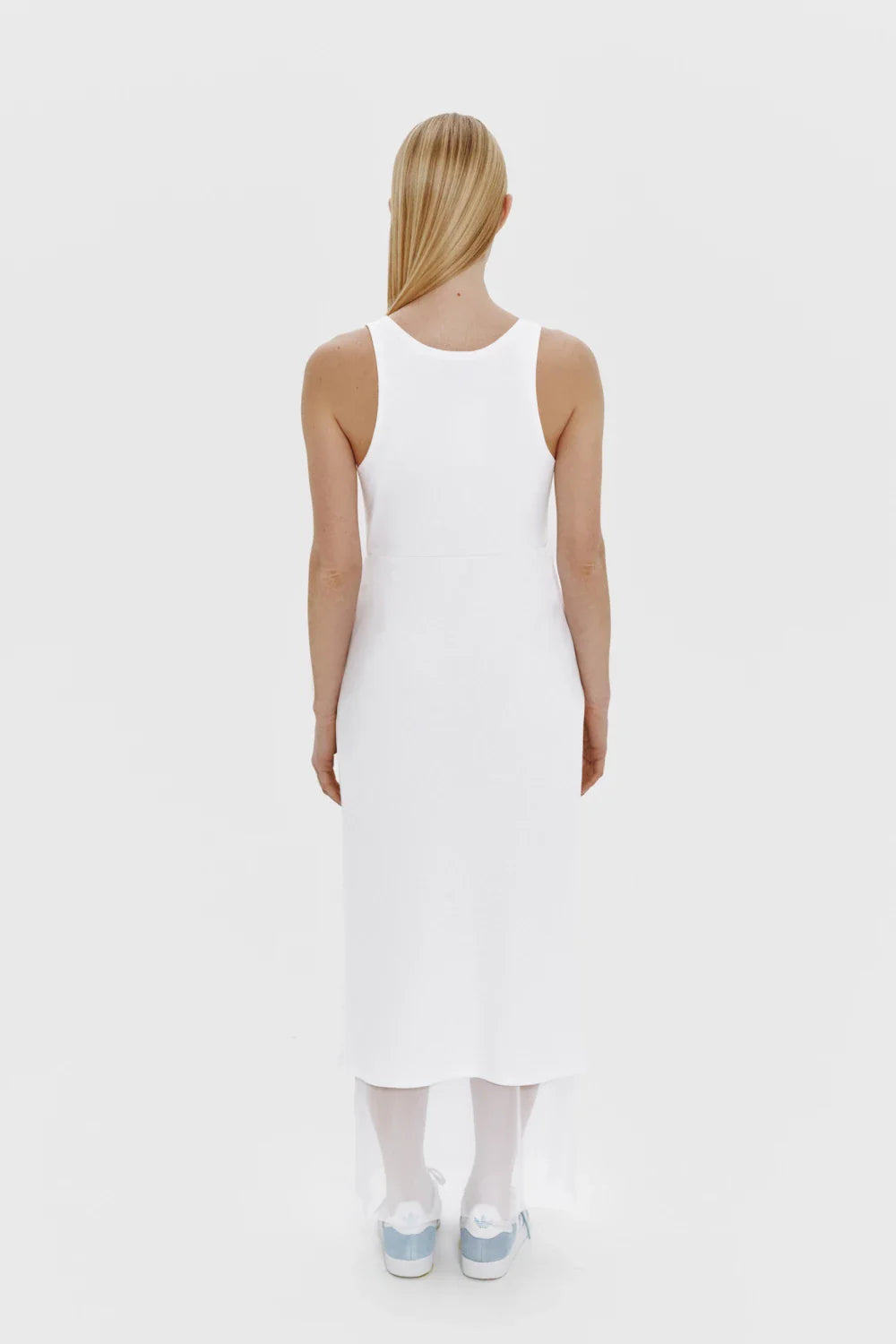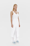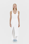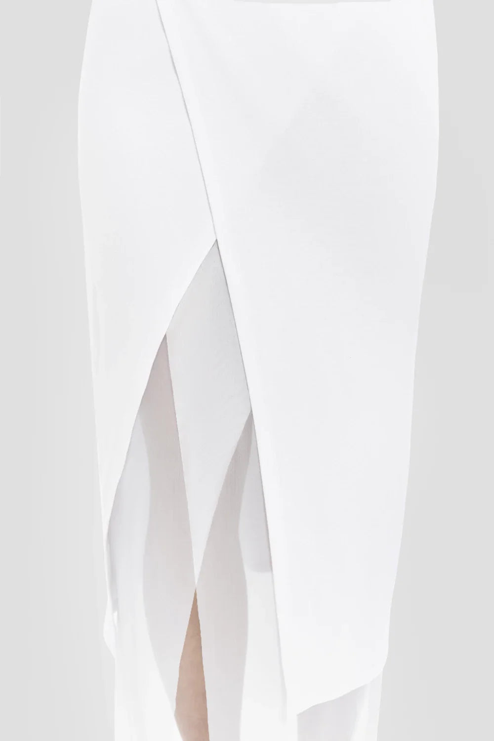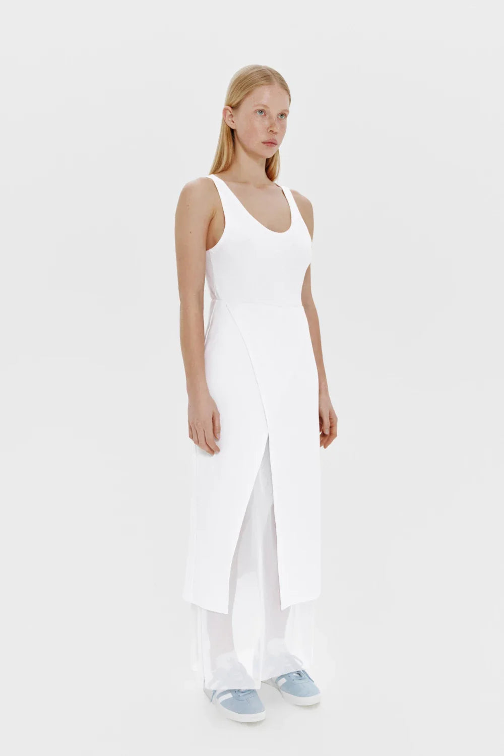 "petals" dress in white from the WOMAN collection, which does not require additional styling, we created a maxi dress with a slit above the knee, and added a decorative element in the form of a mesh, which adds tenderness and lightness to the image