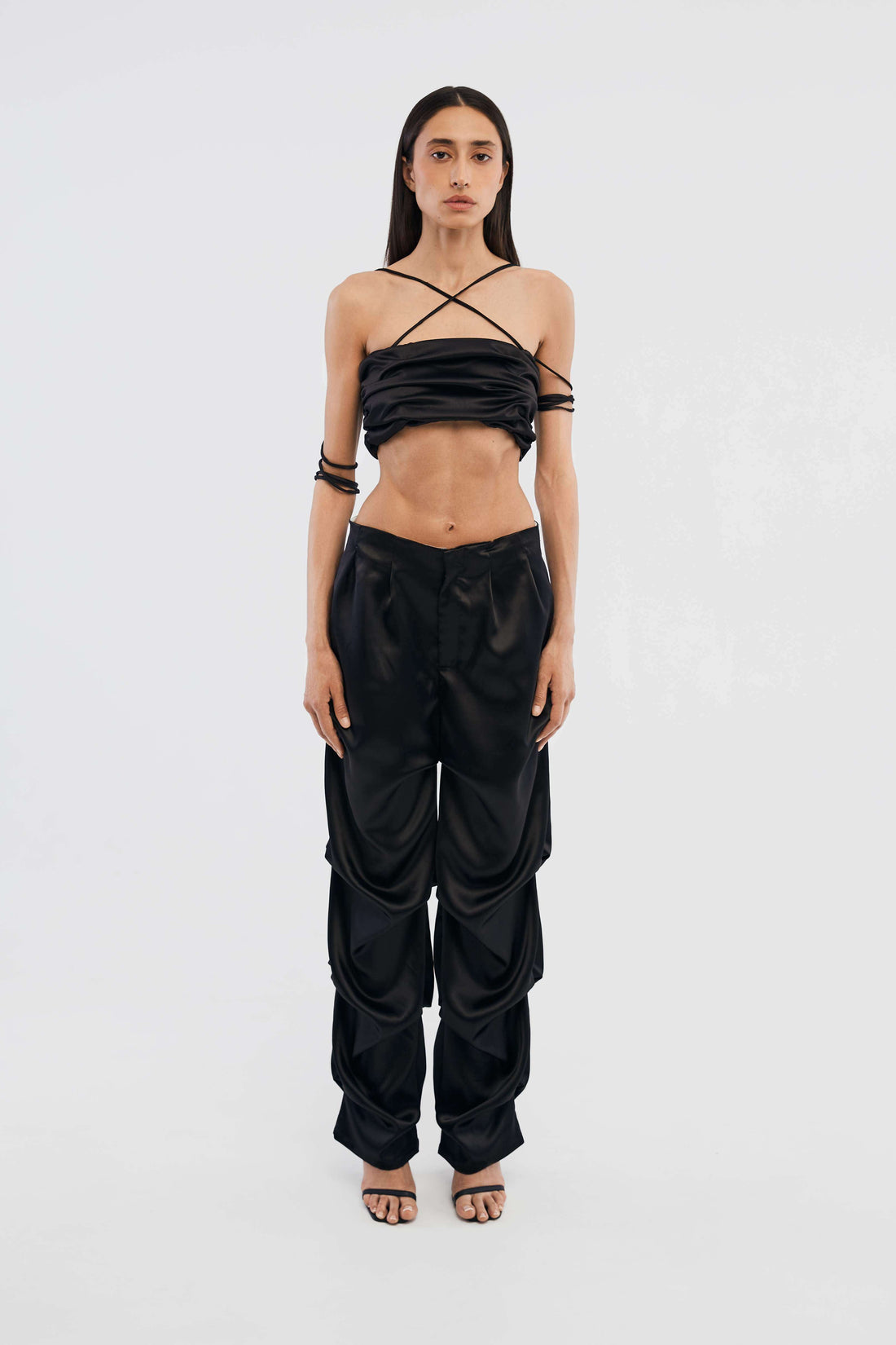 to create sexy looks, you can wear seamless underwear or a top under it. black tops are successfully combined with things made of leather or satin, for example, you can wear leather pants and a satin bomber jacket or jacket on top