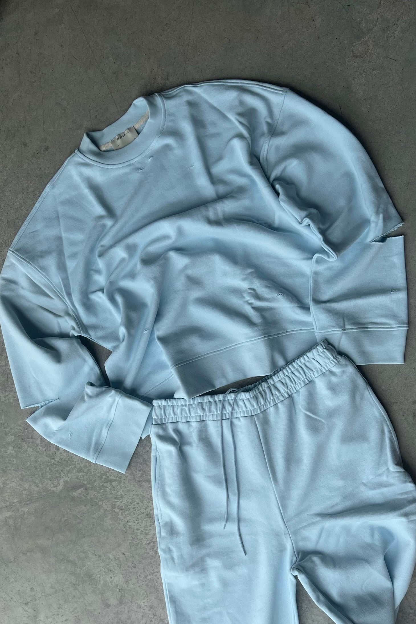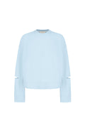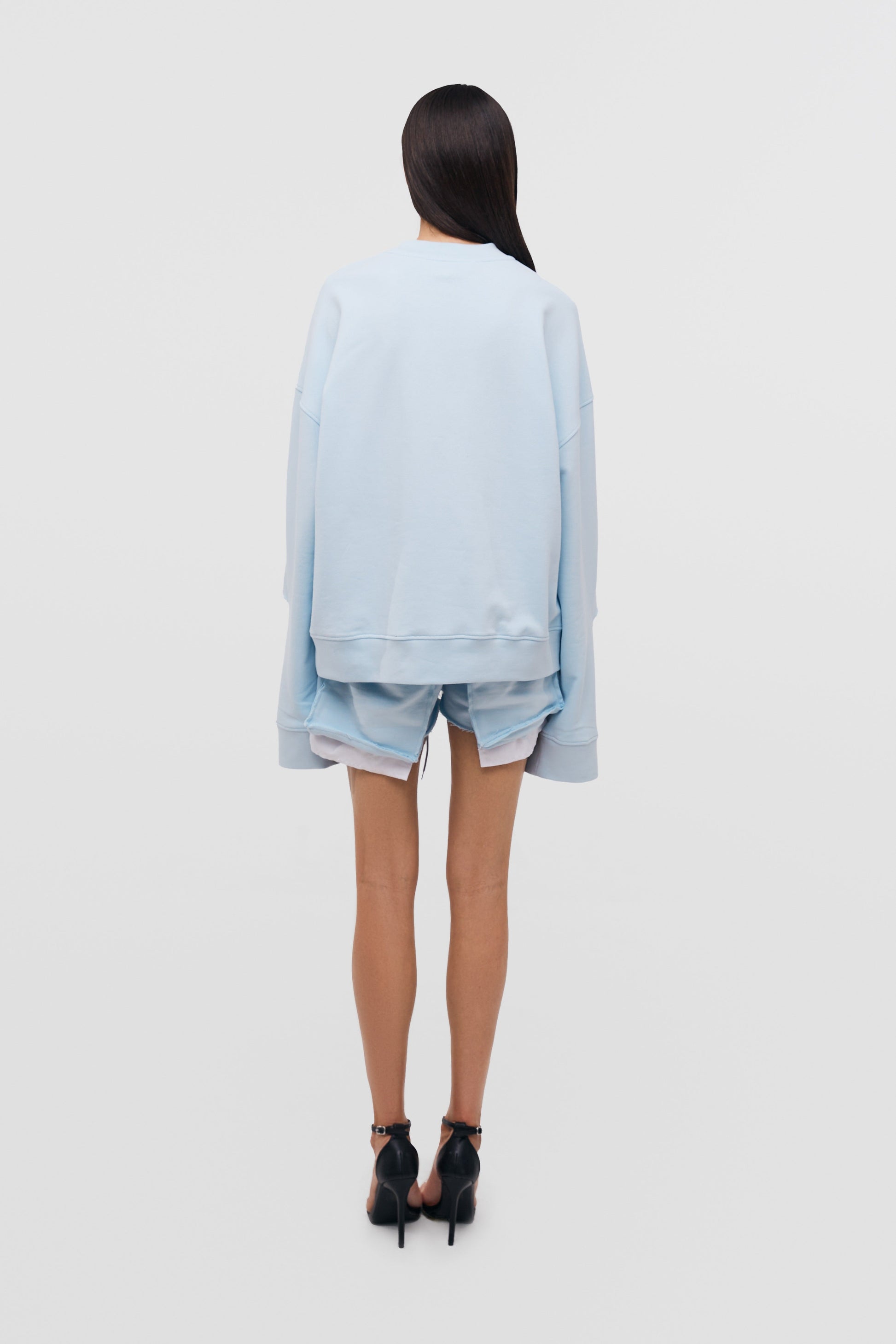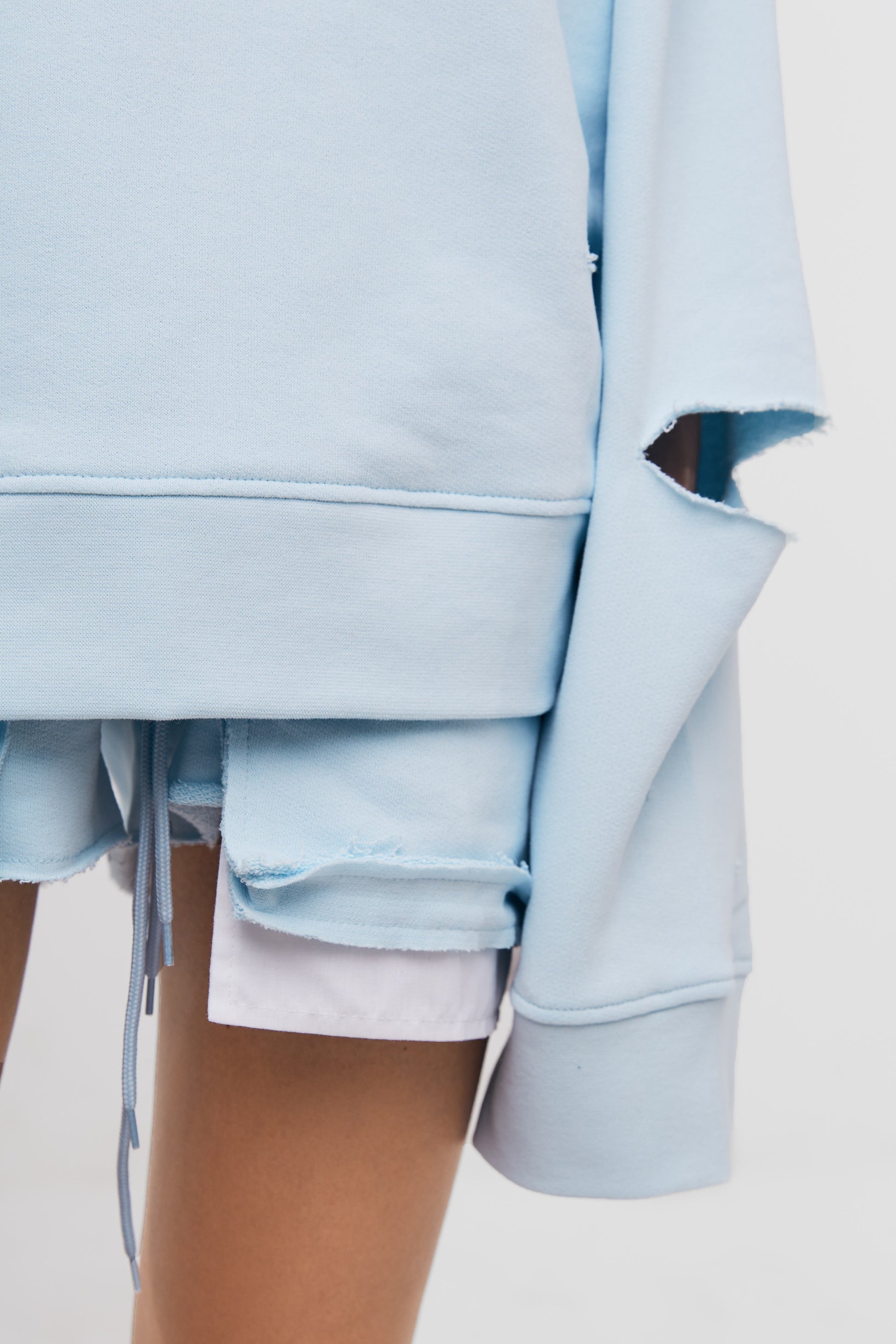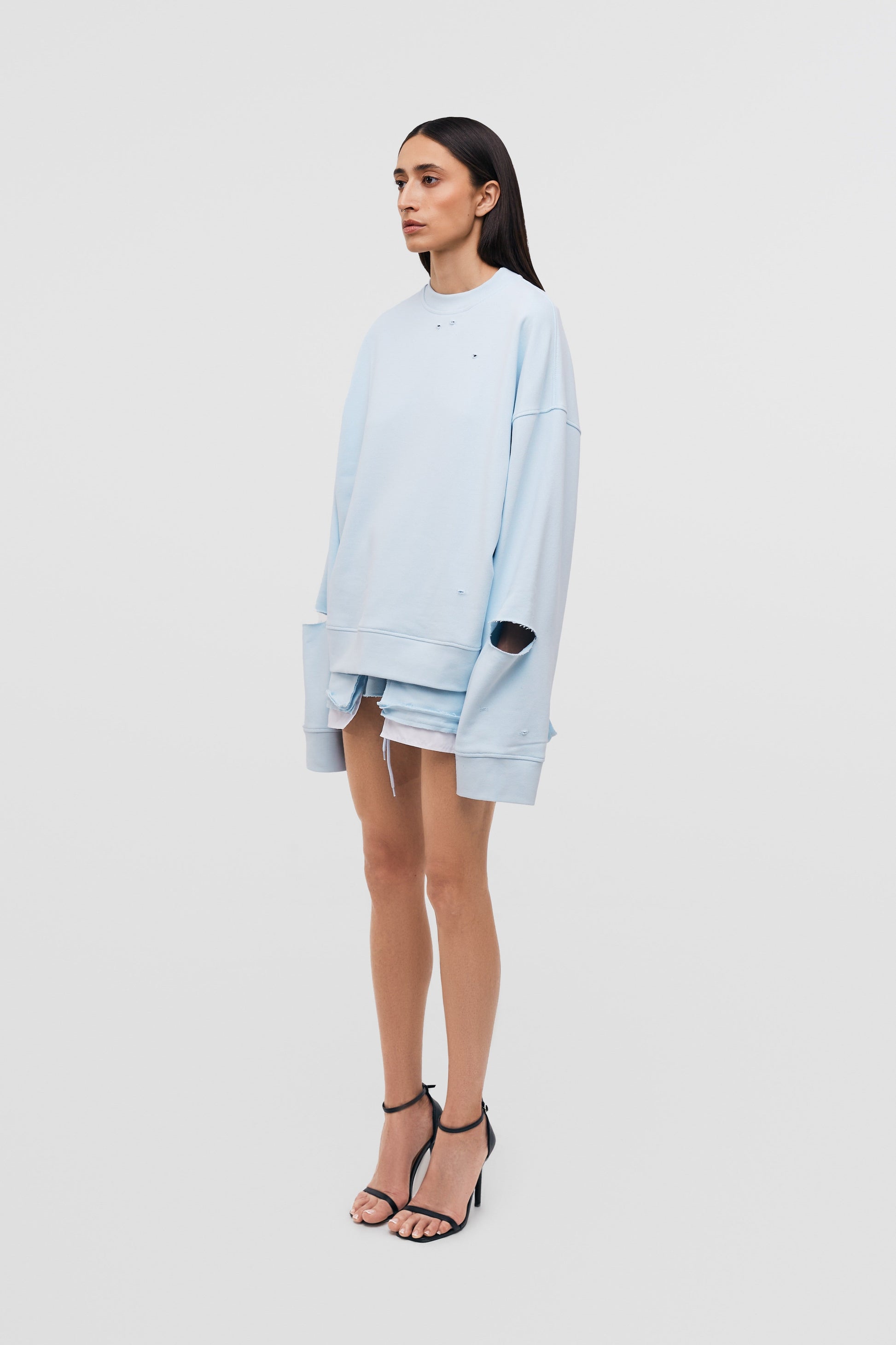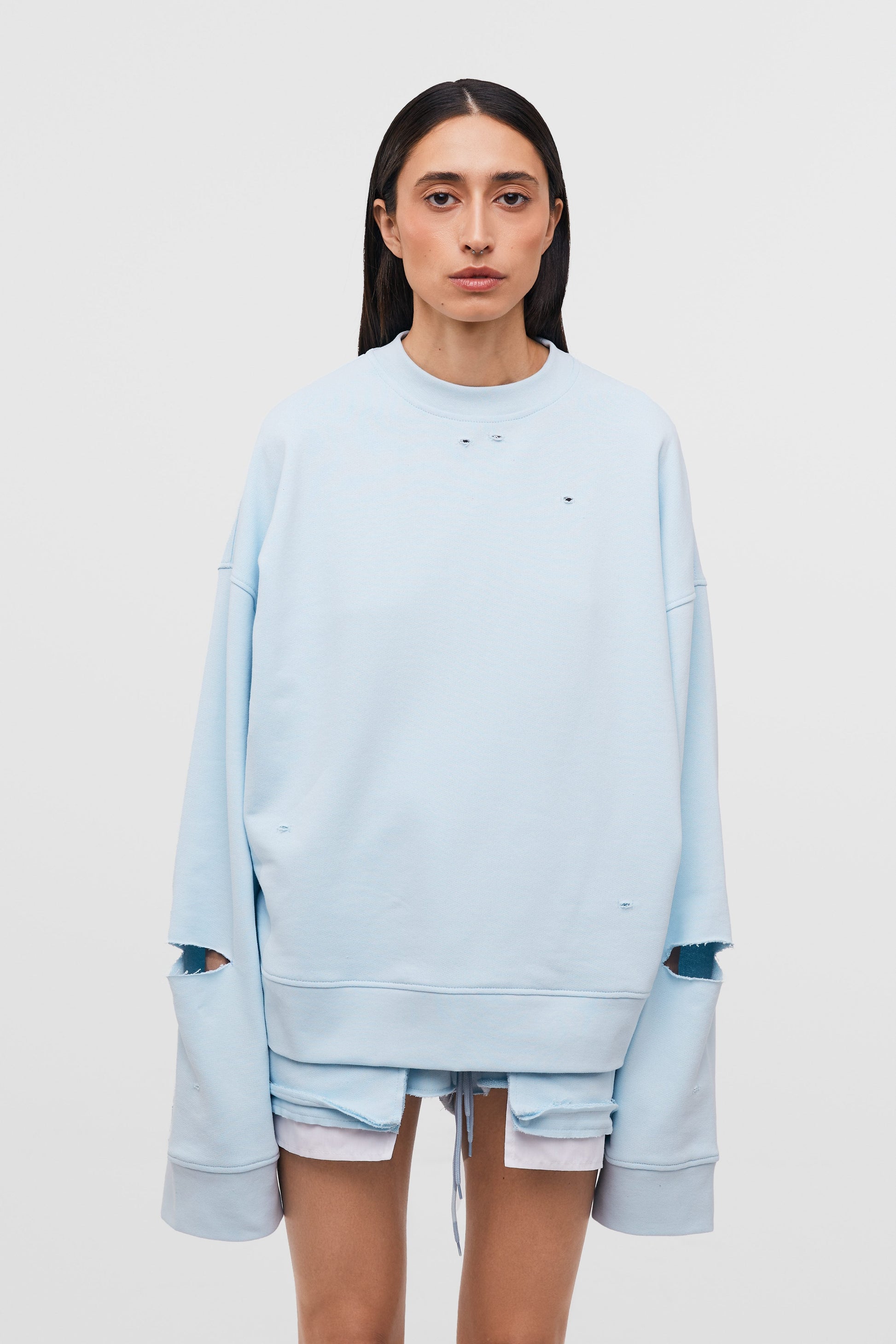 the sweatshirt "destroyed" in blue is made in an oversize style, with a round neck and wide elongated sleeves. there are slits on the front and sleeves - one of the main elements of the "70s" collection in the spirit of punk culture