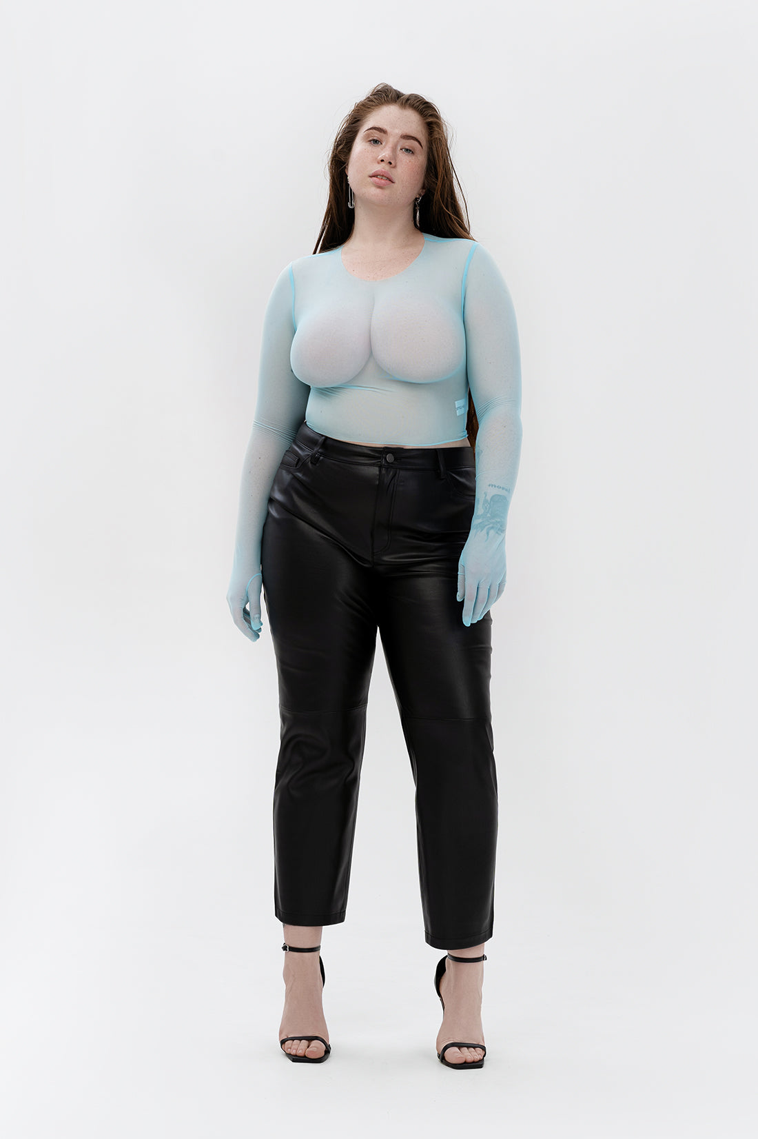 the 'lilith' mesh top in blue fits perfectly due to the elastic mesh, which stretches well, is pleasant to the body and does not hinder movements, so you can dance, take selfies and be the center of attention. the phone sensor responds well to your gloved hands