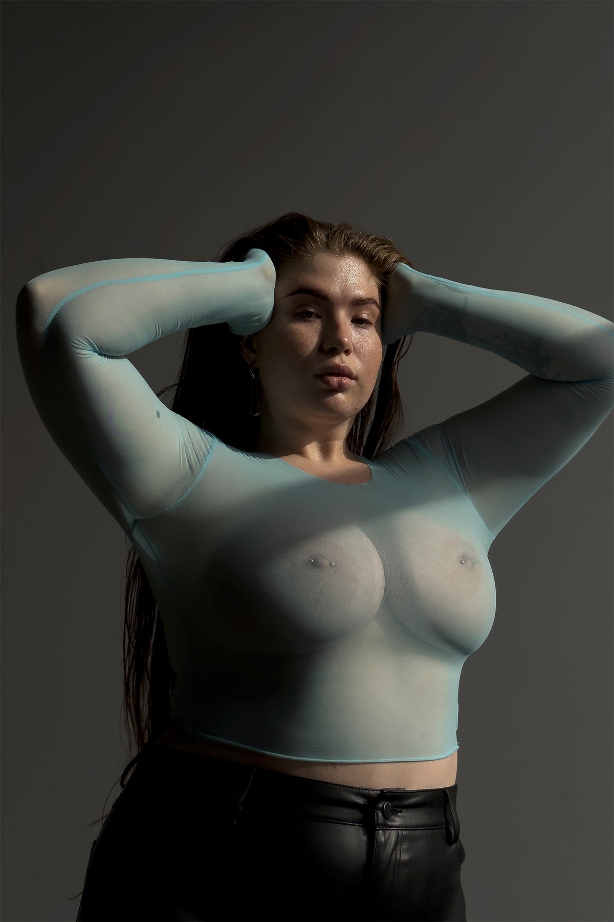 the top has a sheer silhouette, so you can wear seamless underwear or a double mesh top in the same color to create looks. it can be combined with basic pieces, such as r'eal big' or 'groove' pants, or with more dramatic ones, such as a silver or leather skirt