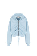 zip-up crop hoodie is shortened in blue and has long drawstrings that allow you to adjust its length, creating cool looks. it is easy to combine with destroyed shorts or real big pants, as it is a basic item of the collection