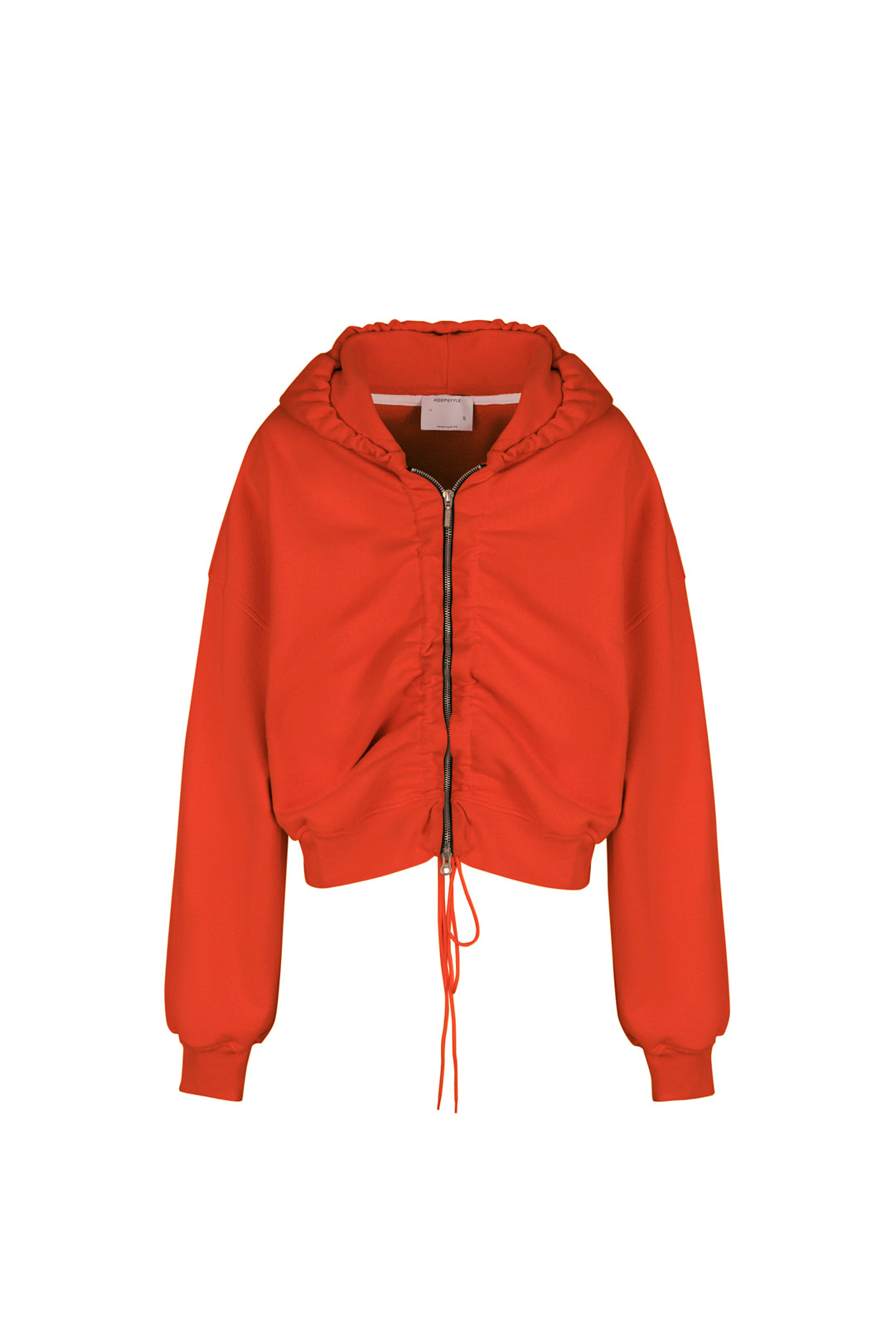 the cropped zip-up hoodie in red color has long drawstrings that allow you to adjust its length, creating cool looks. it can be easily combined with destroyed shorts or real big pants, as it is a basic item of the collection