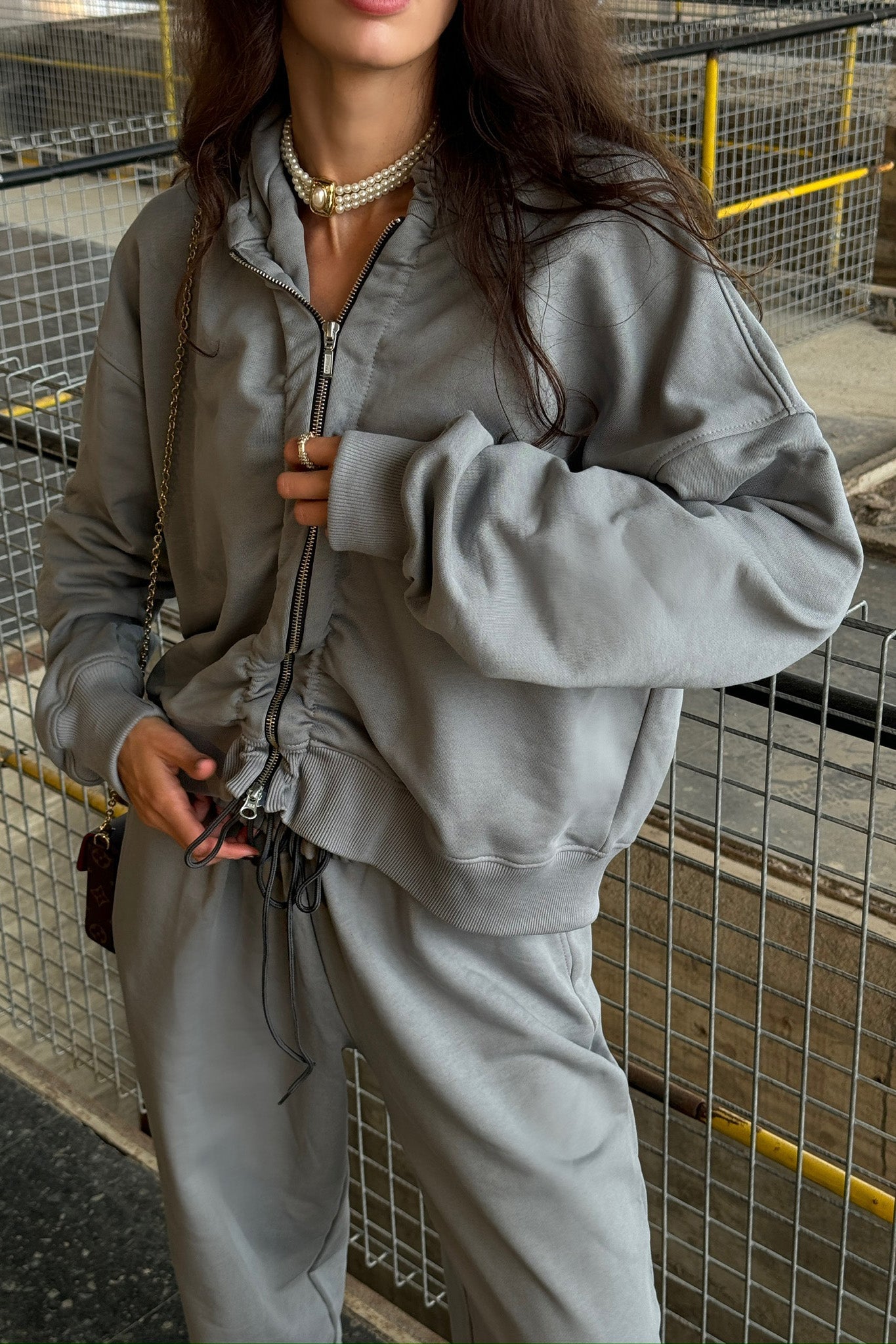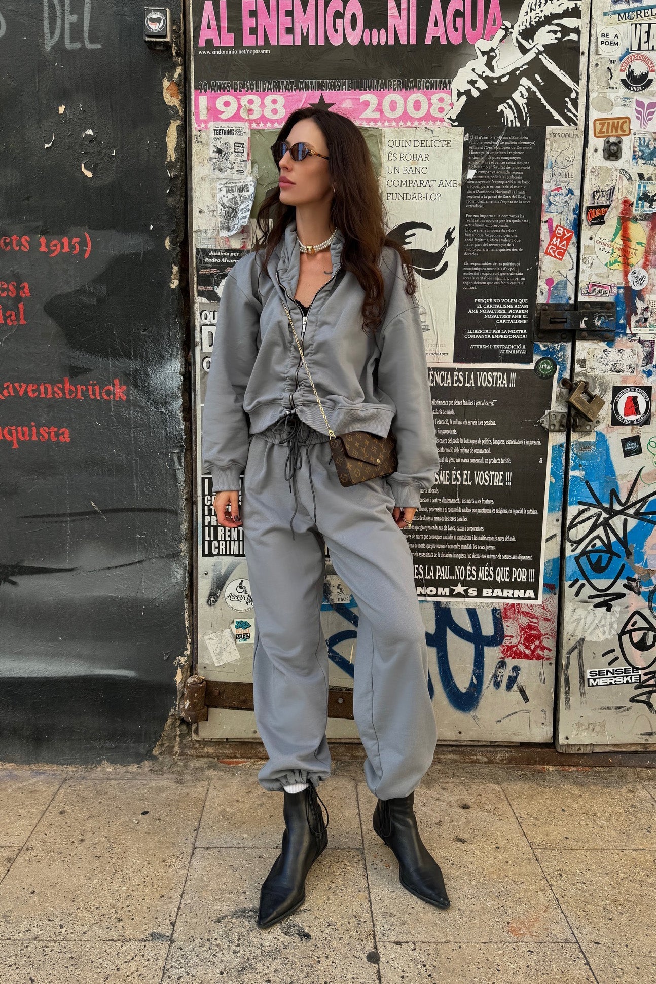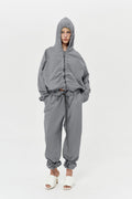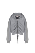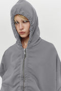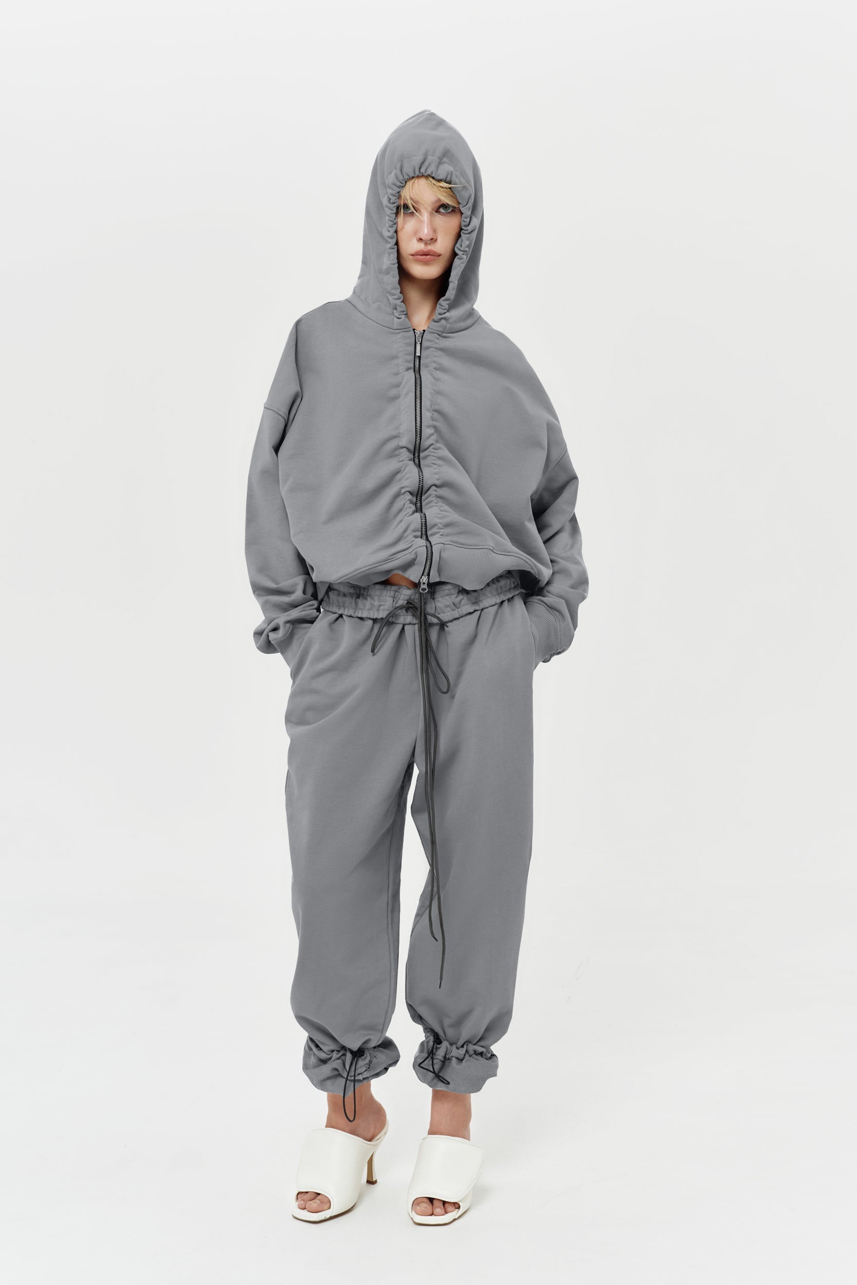 the cropped zip-up hoodie in grey has long drawstrings that allow you to adjust its length, creating cool looks. it can be easily combined with destroyed shorts or real big pants, as it is a basic item of the collection